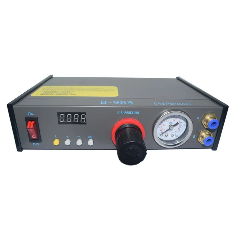 Description:It can be used in medical equipment, toys, optical electronics, packaging, automotive electronics and other occasions in UV glue, A B glue, COB glue, medical, EPOXY, red glue, silver glue, instant glue, conductive glue, heat dissipation aluminum glue, sealant, silica gel, flux, electrolyte, lubricating oil, resin and other dispensing operations. Detailed : 1. In the monitoring mode, two working modes can be set: manual and quantitative. 2. Adopt high-precision 4-digit display high-precision timing control to quantitatively control glue discharge. 3. The negative pressure of suction can be manually adjusted to prevent glue dripping. 4. Simple setting and user-friendly operation. 5. Economical is suitable for mass production operations. 6. It is suitable for manual gluing and manipulator automatic production and other glue control occasions.